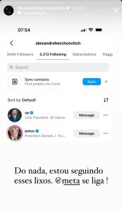 “Do nada, estou seguindo esses lixos [Trump e JD]. @meta se liga!”, publicou o designer de moda brasilerio, Alexandre Herchcovitch.