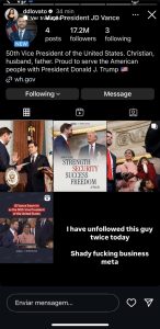 As polêmicas envolvendo a recente posse do presidente dos Estados Unidos, Donald Trump, não se restringiram apenas às primeiras medidas tomadas. Usuários do Facebook e Instagram estão denunciando, nesta quarta-feira (22), que passaram a seguir involuntariamente as contas de Trump (@potus) e de JD Vance (@vp), o vice-presidente.