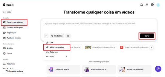 Faça um teste gratuito acessando sua conta e usando a aba “Gerador de vídeos” na opção “Mídia”. Adicione manualmente imagens do seu dispositivo ou nuvem, ou cole uma URL para que a ferramenta identifique automaticamente. Esse é o ponto de partida perfeito para seu projeto. Use o recurso gratuito de animação de fotos em vídeo com IA do Pippit para começar sem complicação.