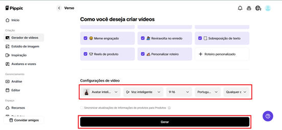 Escolha “Mais informações” para incluir logotipo, público-alvo e preço. Em seguida, vá em “Opções” para selecionar um avatar e definir uma narração que personalize o resultado. É possível também ajustar o roteiro gerado pela IA para adequá-lo ao seu público. Quando estiver satisfeito, basta clicar em “Gerar” para criar seu próprio vídeo de fotos.