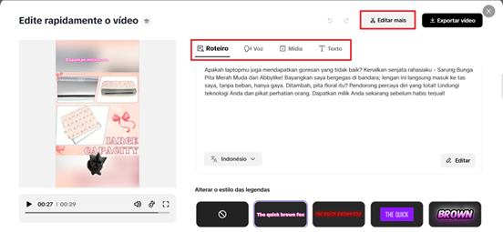 Assista ao vídeo para conferir a qualidade. Use o recurso “Edição rápida” para ajustar roteiro, aparência das legendas, avatar e voz. Experimente estilos diferentes até encontrar o ideal. Para edições mais detalhadas, selecione “Editar mais” e explore opções avançadas.