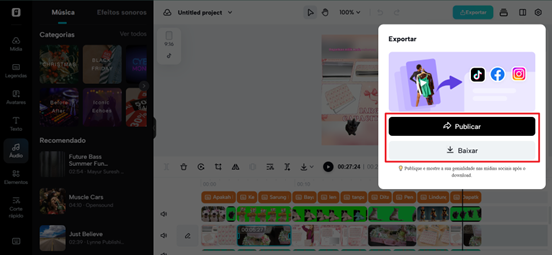 Quando tudo estiver pronto, exporte seu vídeo em alta resolução, pronto para compartilhar em diversas plataformas ou usar em campanhas de marketing.