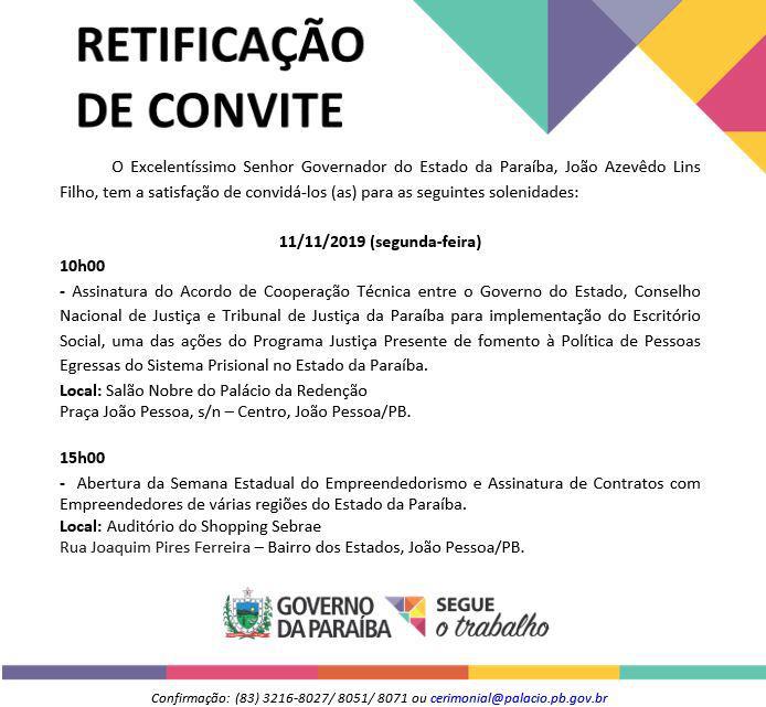 Na parte da tarde, o governador ainda participará da Solenidade de Abertura da Semana Estadual do Empreendedorismo e assinatura de contratos com empreendedores da Paraíba, às 15h, no Auditório do Shopping Sebrae.