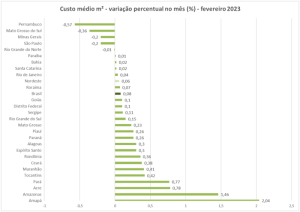 O custo médio da construção civil na Paraíba registrou variação de 0,01% em fevereiro, frente a janeiro, de acordo com o Índice Nacional da Construção Civil (Sinapi), divulgado nesta sexta-feira (10), pelo IBGE. O indicador, que ficou abaixo das médias nacional (0,08%) e regional (0,06%), foi o 6º menor do país e o 3º menor do Nordeste.