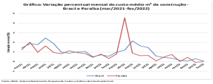 No acumulado de 12 meses, em fevereiro, o custo paraibano apresentou alta de 9,64%, ao passo que, no índice brasileiro, a variação foi de 9,92% e, no nordestino, de 8,36%. No ano, até então, essas variações foram de –0,06%, 0,39% e 0,09%, respectivamente.