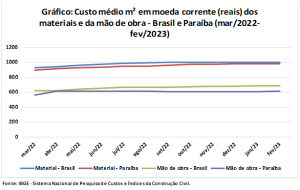 Do total paraibano, a maior parte era referente ao custo com material (R$ 978,86), ao passo que o custo com mão de obra correspondia à menor parcela (R$ 611,65). Essa tendência também foi observada na média geral das unidades da federação, em que ambos os valores, de R$ 1.001,94 e R$ 683,80, respectivamente, ficaram acima dos constatados no estado.