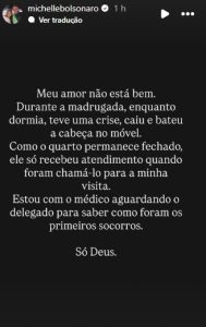 “Meu amor não está bem. Durante a madrugada, enquanto dormia, teve uma crise, caiu e bateu a cabeça no móvel. Como o quarto permanece fechado, ele só recebeu atendimento quando foram chamá-lo para a minha visita. Estou com o médico aguardando o delegado para saber como foram os primeiros socorros. Só Deus”, escreveu a ex-primeira-dama em seus stories.
