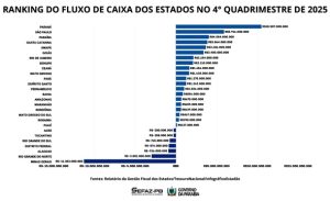Com base nos dados do Relatório de Gestão Fiscal, a Paraíba registrava 4,054 bilhões como reserva no terceiro quadrimestre de 2025, o que deixa o Estado na terceira posição com maior fluxo de caixa. Os estados do Paraná (R$ 10,507 bilhões) e de São Paulo (R$ 5,916 bilhões) lideram em valores nominais o ranking das reservas das unidades da federação. O relatório considera os recursos do caixa os não vinculados, ou seja, aqueles que não estão carimbados por lei para áreas específicas e demonstram a real saúde financeira dos Estados.