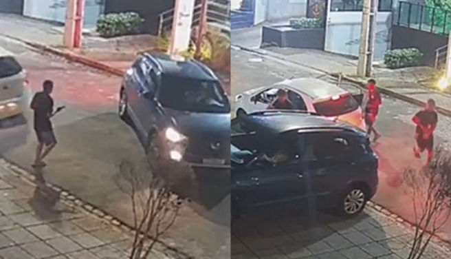 As imagens mostram o momento em que a vítima saía de um prédio dentro do carro quando outro veículo parou atrás. No momento seguinte, os suspeitos saem do carro e tentam tomar o veículo que a mulher estava dirigindo.