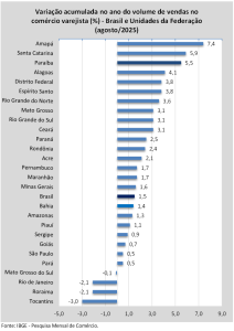 As variações acumuladas no ano pelo comércio varejista ampliado estadual, em relação ao mesmo período de 2024, foram igualmente positivas e expressivas, de 5,1% no volume de vendas, a segunda melhor do Brasil; e de 8,7% na receita nominal, a terceira maior do país, ambas superiores às médias brasileiras, que ficaram em -0,3% e 4,3%, respectivamente.