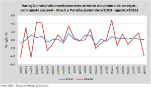 A Paraíba fez parte do grupo com variação positiva, com crescimento de 0,9% no volume de serviços, registrando um aumento abaixo da média nacional (2,5%) e ocupando a última (19ª) posição entre as Unidades da Federação com variação positiva. Em sentido oposto, Bahia (-6,8%) e Minas Gerais (-1,8%) lideraram as perdas, seguidos por Espírito Santo (-1,6%), Rio de Janeiro (-0,2%) e Amazonas (-1,9%).
