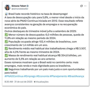 De acordo com os dados de Tebet, confirmados pelo IBGE, 6,045 milhões de brasileiros estavam desocupados em setembro, queda de 11,8% em relação ao mesmo período de 2024. Além disso, houve um cresicemento de 1,4 milhão de pessoas empregadas no período de um ano – alcançando o patamar de 102,4 milhões de brasileiros com empregos.