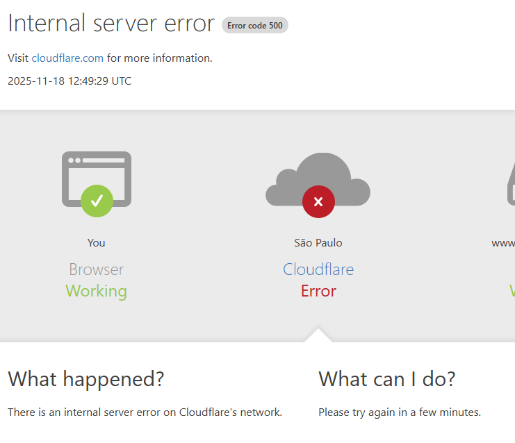 “A Cloudflare está ciente e investigando um problema que afeta vários clientes: erros do Widespread 500, Cloudflare Dashboard e API também falhando. Estamos trabalhando para entender o impacto total e mitigar esse problema. Mais atualizações a seguir em breve”.