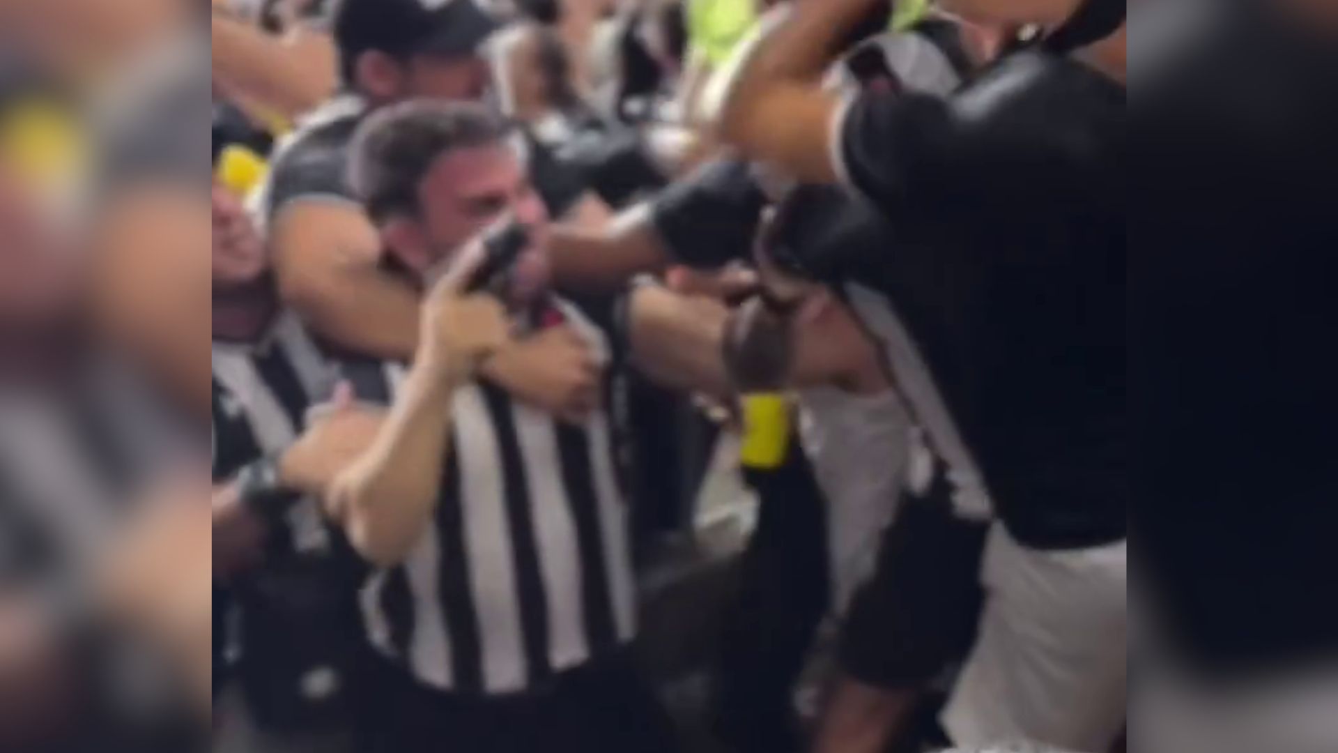 Após sofrer uma queda e ser auxiliado a se levantar, o indivíduo saca uma pistola e a direciona para outros torcedores envolvidos no conflito. Pouco tempo depois, ele guarda a arma na cintura e é abordado por um quarto homem, que tenta mediar a situação.