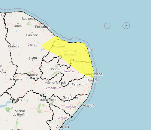 De acordo com o órgão, o alerta atinge municípios do Agreste Paraibano, Mata Paraibana, Borborema e Sertão. A previsão indica chuvas entre 20 e 30 milímetros por hora, podendo chegar a até 50 milímetros por dia, além de ventos com intensidade entre 40 e 60 km/h.