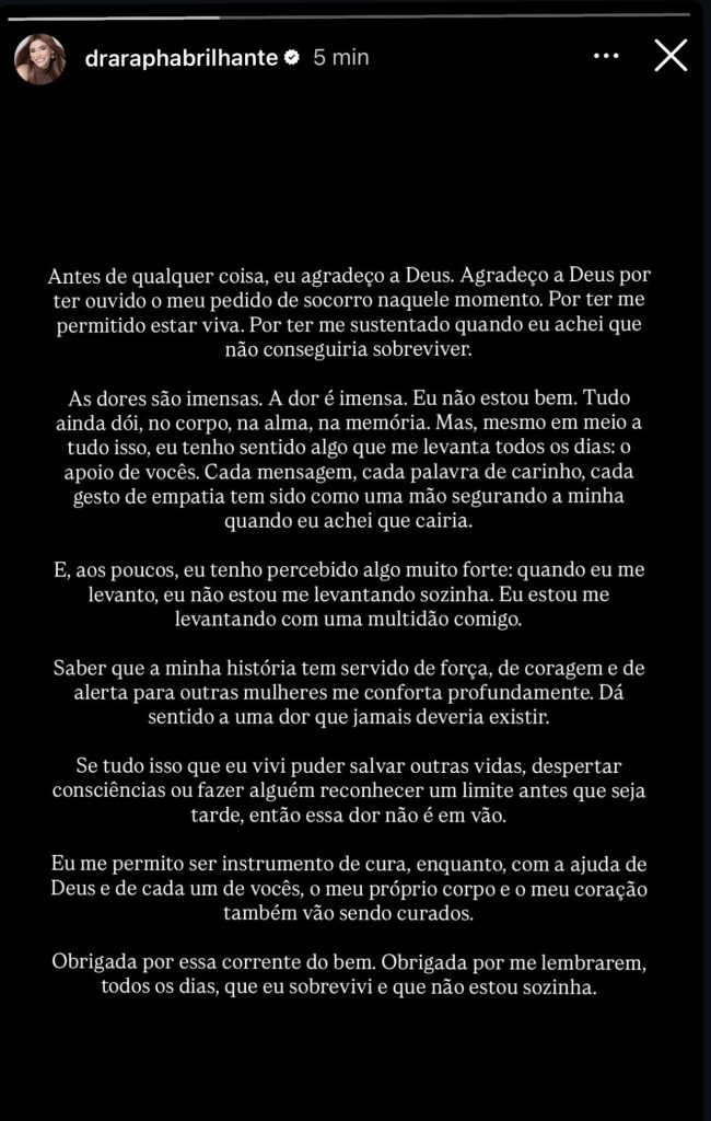 “Agradeço a Deus por ter ouvido o meu pedido de socorro naquele momento”, escreveu Raphaella na publicação. “Tudo ainda dói, no corpo, na alma, na memória. Mas, mesmo em meio a tudo isso, eu tenho sentido algo que me levanta todos os dias: o apoio de vocês”, disse na manifestação.