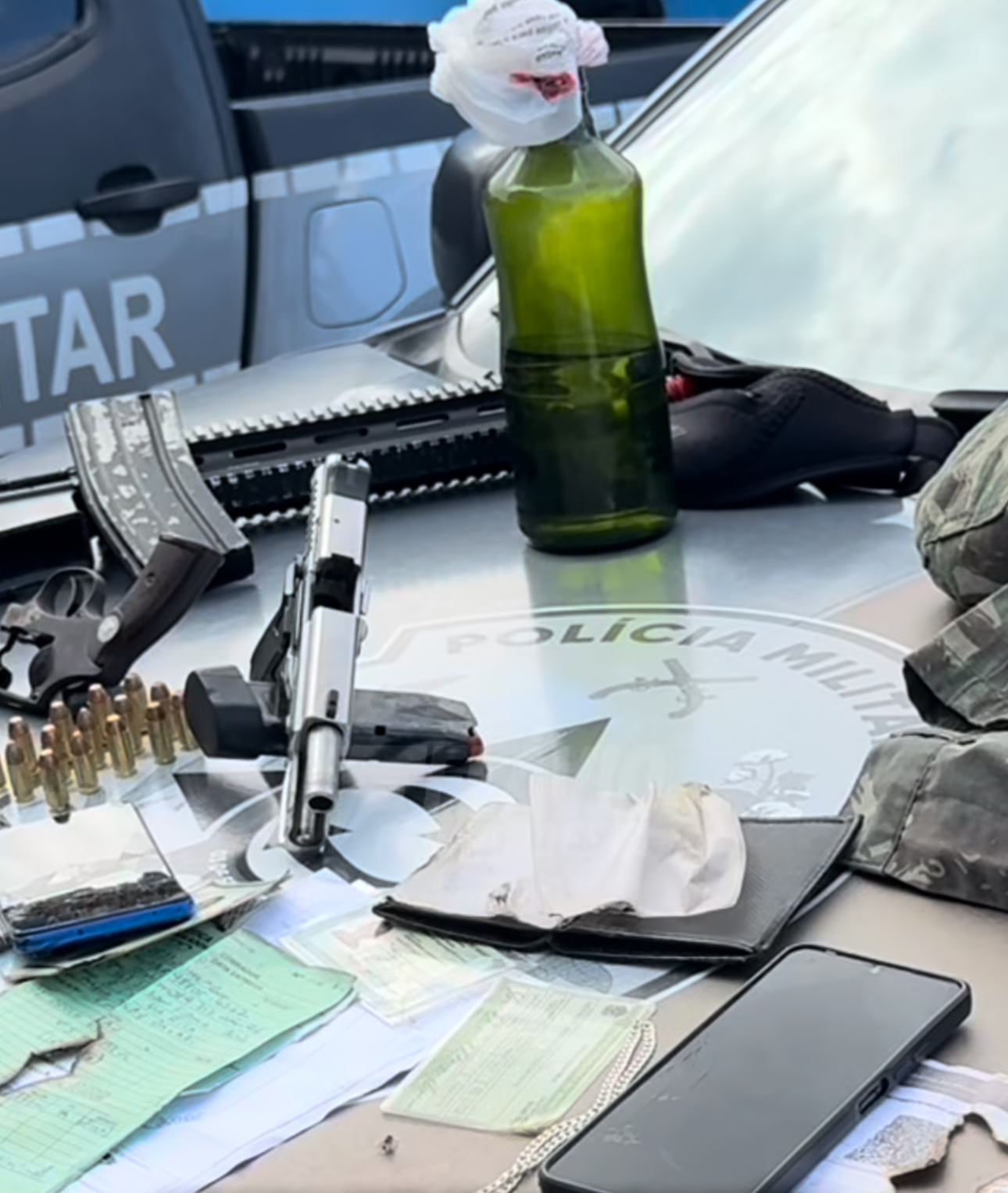 Além do armamento, os policiais localizaram documentos de uma das vítimas do ataque em Santa Rita, que estavam sendo queimados pelos suspeitos no momento da abordagem para tentar eliminar evidências.