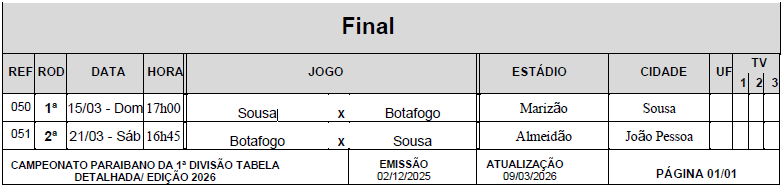 A Federação Paraibana de Futebol (FPF) divulgou nesta segunda-feira (9) a tabela detalhada das finais do Campeonato Paraibano 2026, que voltarão a reunir Botafogo-PB e Sousa na disputa pelo título estadual. A decisão será realizada em dois jogos, com a partida de ida marcada para domingo (15), às 17h, no Estádio Marizão, em Sousa, e o confronto de volta agendado para sábado (21), às 16h45, no Estádio Almeidão, em João Pessoa.