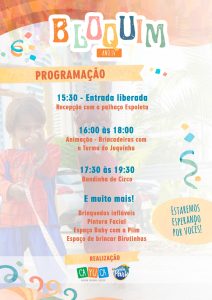 Na programação do Bloquim Ano IV, as crianças poderão se divertir ao som da Bandinha de Circo, brinquedos infláveis, pintura facial, animação com a Turma do Juquinha, brincadeiras com o Palhaço Espoleta e muito mais!