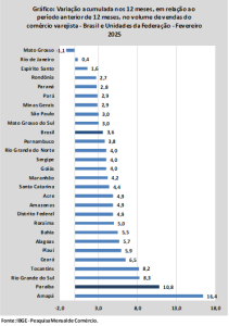 Já no acumulado de 12 meses, em relação ao período anterior de 12 meses, o estado apresentou variações positivas, de 10,8%, no volume de vendas, e de 13,6%, na receita nominal. Além dos avanços registradores bem superiores às contribuições na média brasileira, que foram de 3,6% e 8,2%, respectivamente; o setor estadual ocupa a 2ª posição entre os melhores resultados do país, inferiores apenas aos registrados pelo Amapá, de 22,0% e 16,4%, respectivamente.