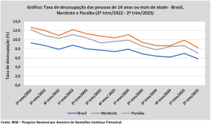De acordo com dados do Instituto Brasileiro de Geografia e Estatística (IBGE) divulgados nesta sexta-feira (15), a taxa de desocupação, também conhecida como taxa de desemprego, na Paraíba caiu para 7% no segundo trimestre de 2025, o menor índice já registrado desde o início da série histórica da Pesquisa Nacional por Amostra de Domicílios Contínua (PNAD Contínua) Trimestral, em 2012.