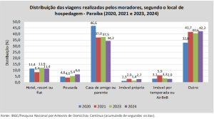 O segundo tipo de local de hospedagem mais frequente entre os viajantes residentes na Paraíba, com 34,2% (95 mil viagens) em 2024, foi a Casa de amigo ou parente que, nas médias brasileira e nordestina, foi a opção de hospedagem mais procurada, com 40,7% e 40,6%, respectivamente.