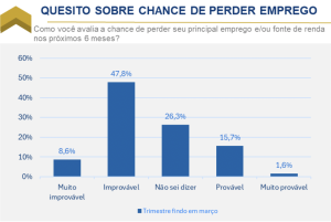 O resultado, com dados do trimestre findo em março de 2026, mostra que a maioria dos respondentes (56,5%) afirma ser muito improvável ou improvável perder seu principal emprego e/ou fonte de renda nos próximos 6 meses, enquanto 17,2% afirmavam ser provável ou muito provável que isso ocorre. Os demais 26,3% indicam que não saberiam avaliar esse tema.