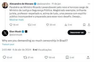 O atual CEO da Tesla, em um de seus ataques, respondeu a postagem do ministro com o questionamento: “Por que vocês estão exigindo tanta censura no Brasil?”.