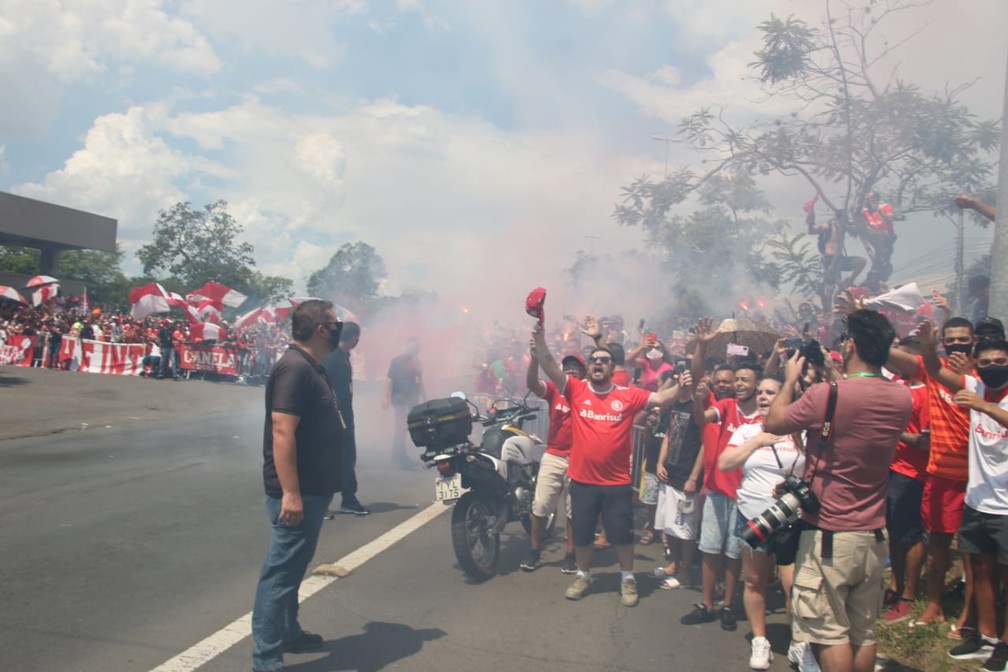 Munidos de sinalizadores, guarda-chuvas, bandeiras e outros adereços, os colorados pintaram de vermelho a Avenida Sertório desde o final da manhã até as 14h07, quando o ônibus da delegação passou pelo portão para adentrar o terminal. Muitos, inclusive, sem máscaras ou com elas abaixadas.