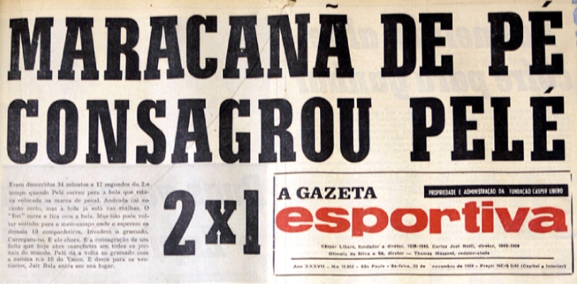 Para outra parte da imprensa, o feito ocorreu naquele mesmo ano, mas sete dias depois, na noite de 19 de novembro, na vitória santista sobre o Vasco por 2 a 1, no Maracanã, com 70 mil presentes. A mesma Gazeta Esportiva estampou novamente em sua capa: “Maracanã de pé consagrou Pelé“, contrariando todos os outros jornais e a ela mesmo.
