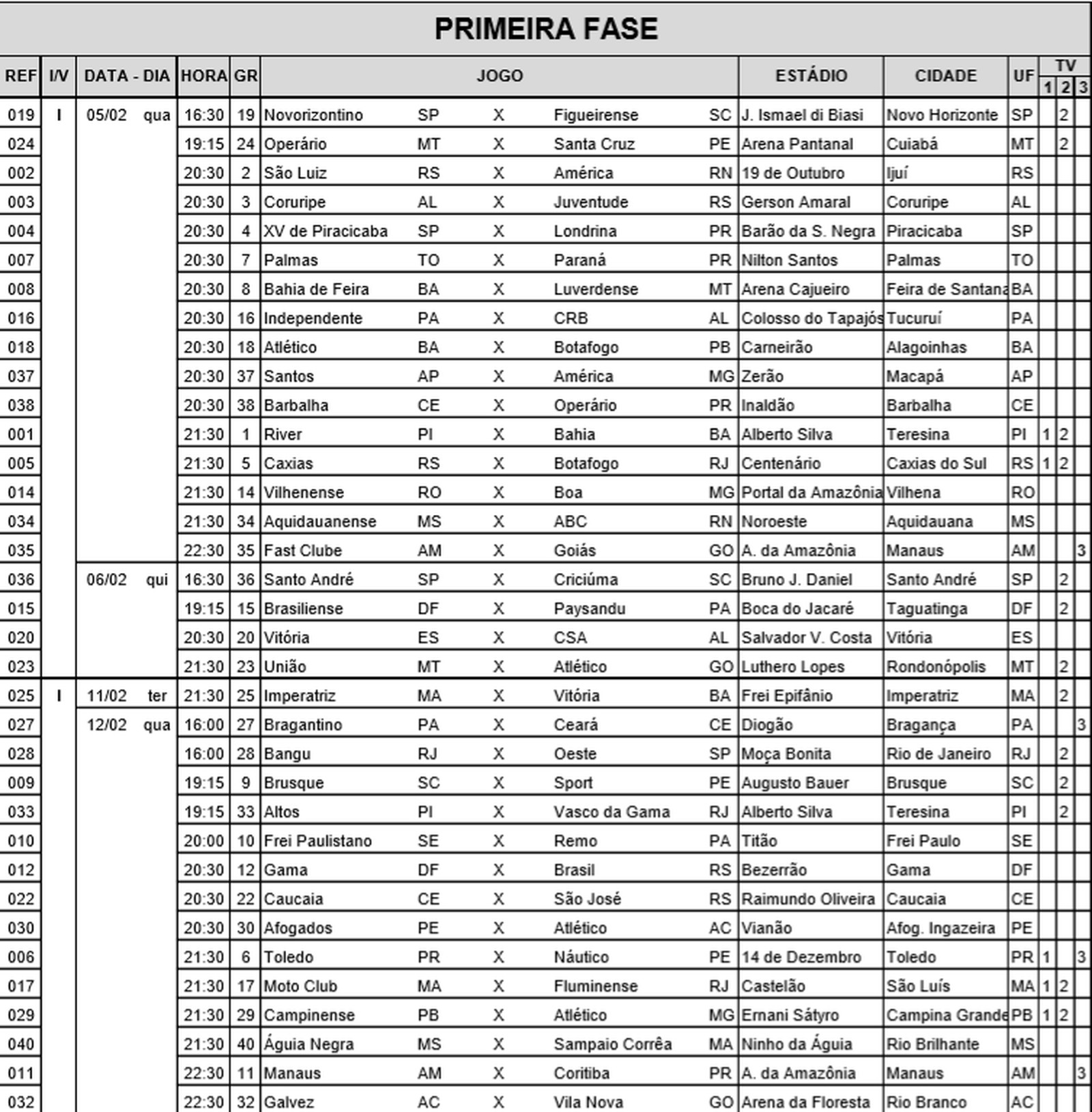 A Confederação Brasileira de Futebol (CBF) divulgou na tarde desta sexta-feira (10) a tabela detalhada da edição 2020 da Copa do Brasil. Foram definidos todas as datas, horários e locais das partidas válidas pela primeira fase da competição, que começa a ser disputada no dia 5 de fevereiro.