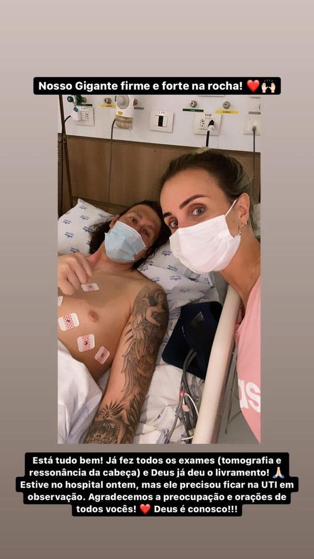 Na manhã desta terça-feira, a esposa do goleiro publicou uma foto ao lado dele no leito hospitalar e tratou de tranquilizar os fãs. Confira: