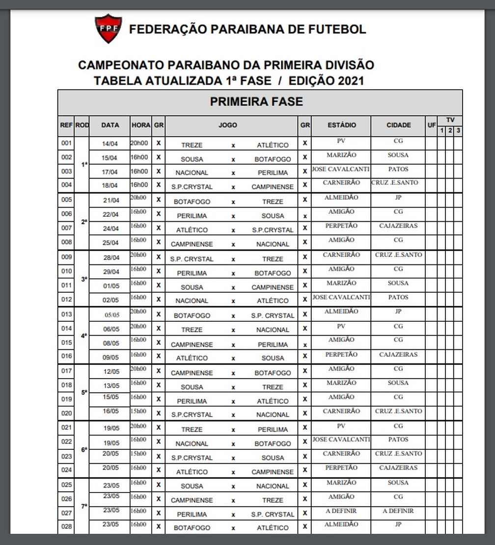 A Federação Paraibana de Futebol (FPF) divulgou na manhã desta terça-feira (30) a tabela detalhada da primeira fase do Campeonato Paraibano de 2021.