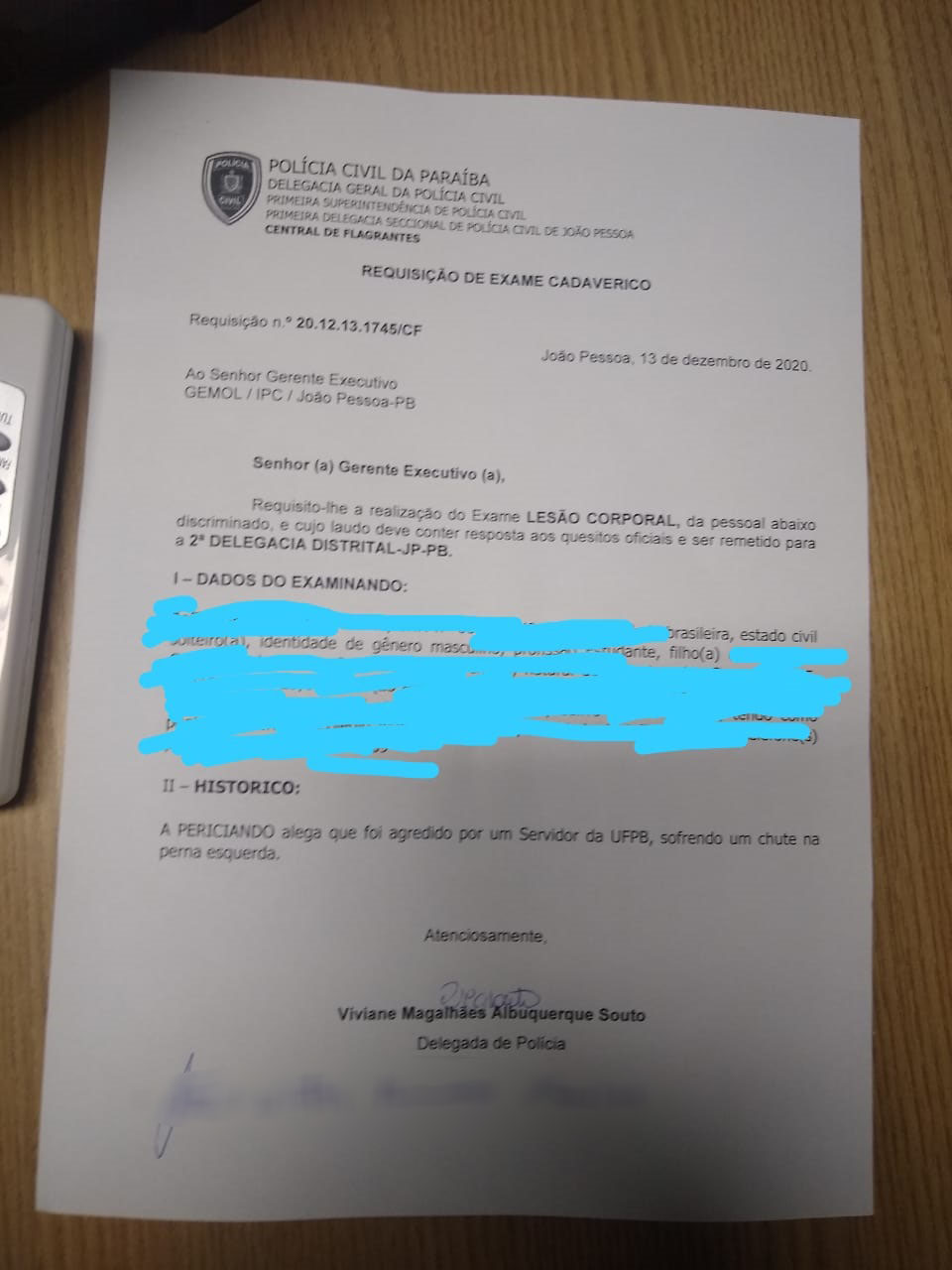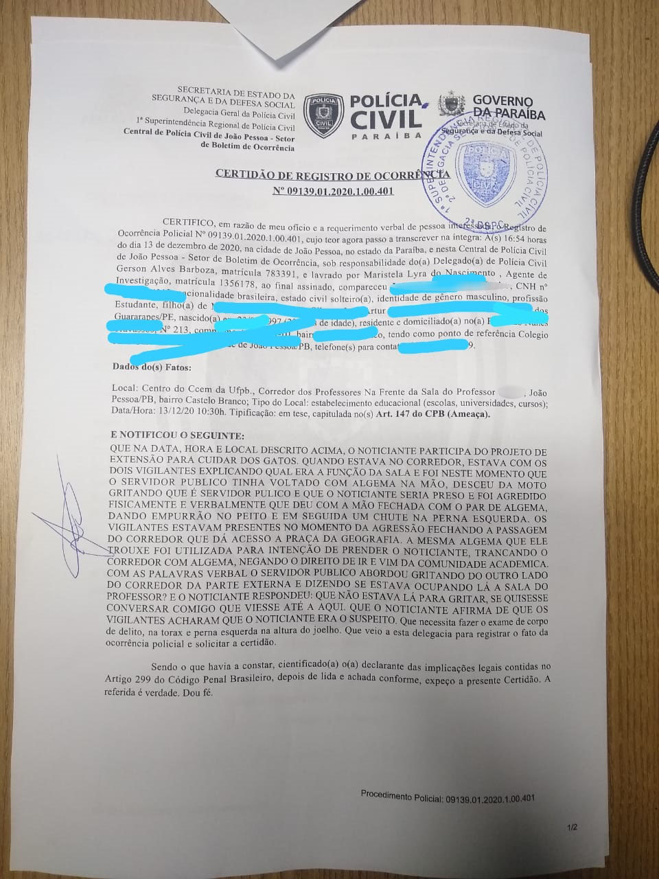 O professor contou ainda que, ao chegar à UFPB, solicitou a abertura do local ao chefe de segurança, que enviou três seguranças. Um deles teria participado do caso das ameaças e agressões.