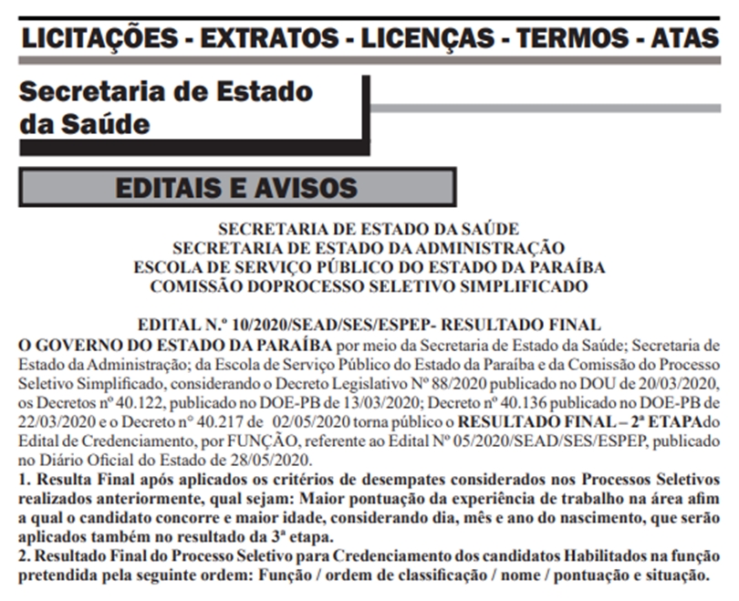 O Governo da Paraíba, por meio da Secretária de Estado da Saúde (SES-PB) divulgou, em publicação no Diário Oficial do Estado (DOE), nesta terça-feira (30), a lista com o resultado final da seleção de profissionais de saúde que podem atuar no combate ao novo coronavírus no Estado.