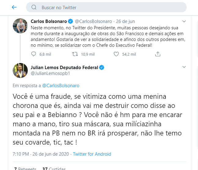 “Você é uma fraude, se vitimiza como uma menina chorona que és, ainda vai me destruir como disse ao seu pai e a Bebiano?” Você não é hm [homem] para me encarar mano a mano, tiro sua máscara, sua miliciazinha montada na PB nem no BR irá prosperar, não lhe temo seu covarde, tic, tac!”, respondeu Julian Lemos.