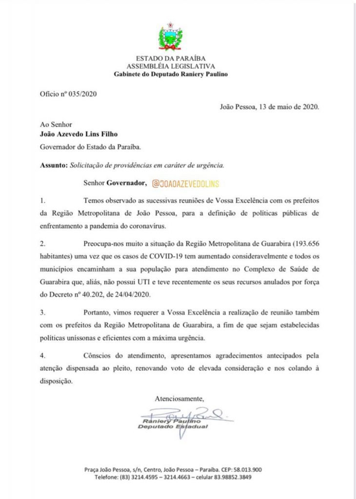 O líder da oposição na Assembleia Legislativa da Paraíba (ALPB), deputado Raniery Paulo, por meio de oficio encaminhado ao governador João Azevêdo, solicitou, em carácter de urgência, uma reunião para definição de políticas públicas de enfrentamento ao novo coronavírus com os prefeitos que compõem a Região Metropolitana de Guarabira.