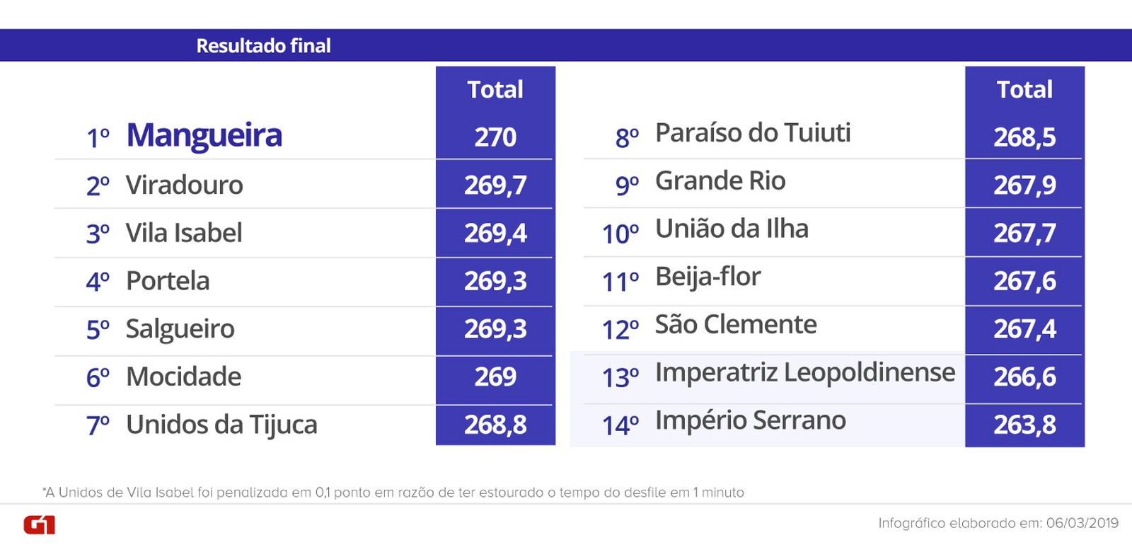 A Estação Primeira de Mangueira é a campeã do Carnaval 2019 do Rio de Janeiro. A escola, que apostou no enredo politizado “Historia para ninar gente grande”, conquistou 270 pontos, a nota máxima possível na apuração. A disputa foi acirrada com a Unidos do Viradouro, que ficou em segundo lugar, com 269,7 pontos. A Beija-Flor, campeã do ano passado, terminou na 11ª posição (de 14 escolas, no total), com 267,6 pontos. A Imperatriz Leopoldinense e a Império Serrano foram rebaixadas.