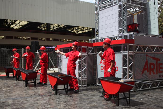 As peças acontecerão em palco diferenciado, composto por estrutura metálica em formato de andaime. No centro, um guindaste de construção transporta os atores, suspensos por cabos de aço, em performances marcantes, circulando todo o espaço cênico disponível. Os trabalhadores têm como arquibancada baldes típicos da construção. Os melhores recursos estéticos, sonoros, de conteúdo, segurança e iluminação fazem parte de cada espetáculo, com cerca de 30 minutos de duração, realizados no início de cada turno de obra.