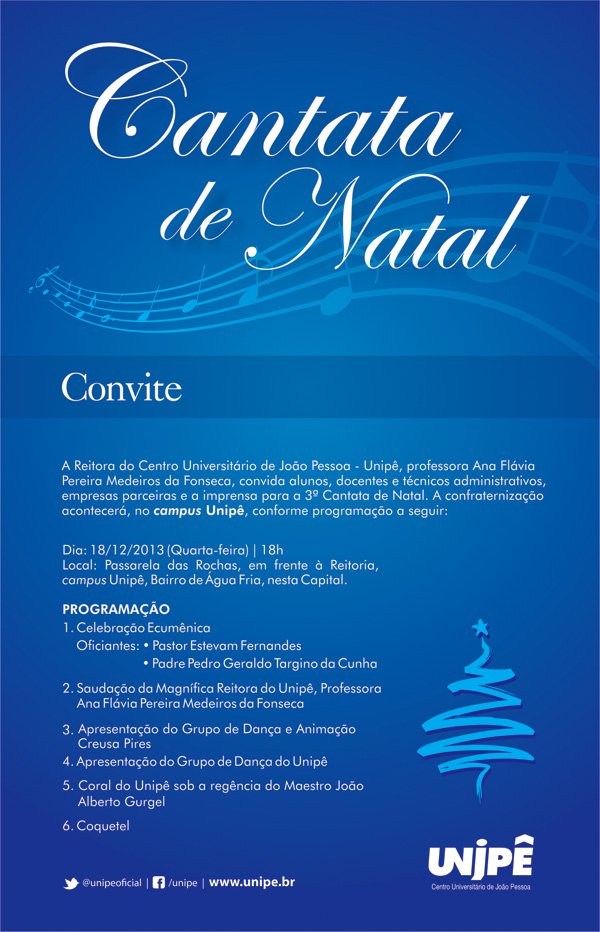 Com 50 integrantes – entre alunos, ex-alunos e professores – o Coral do Unipê apresentará o repertório natalino tradicional, incluindo “Noite Feliz” e “Jesus, alegria dos homens”. “Mas também faremos um pequeno show com as melhores músicas de 2013, entre elas, algumas do ‘repertório anos 80’, cantado no Festival Paraibano de Coros, incluindo Kid Abelha e outras surpresas”, disse o maestro, João Alberto Gurgel