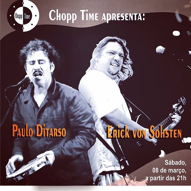 Os cantores Paulo Ditarso e Erick Von Sohsten se apresentam no Chopp Time na noite deste sábado (08), a partir das 21h00.