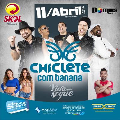 Marcando o começo de uma nova fase, a banda Chiclete com Banana retorna à João Pessoa pela primeira vez após a saída do cantor Bell Marques, trazendo o seu novo projeto intitulado “Vida que segue”, que já conta com o novo vocalista Rafa Chaves. O grupo se apresenta no dia 11 de abril, na Domus Hall, no Manaira Shopping. A programação conta, ainda, com a participação de As Coleguinhas e de Felipe Lemos & Forró do Bem.