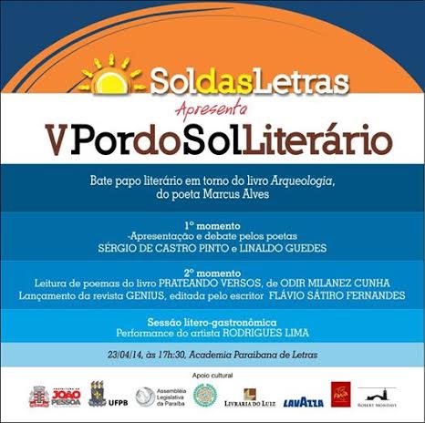 O grupo Sol das Letras promove, a partir das 17h30 de quarta-feira (dia 23), mais uma edição do Por do Sol Literário, na Academia de Letras da Paraíba. A quinta edição do sarau literário terá um debate em torno do livro “Arqueologia”, do poeta Marcus Alves, lançado em novembro de 2013, no Casarão 34, em João Pessoa.