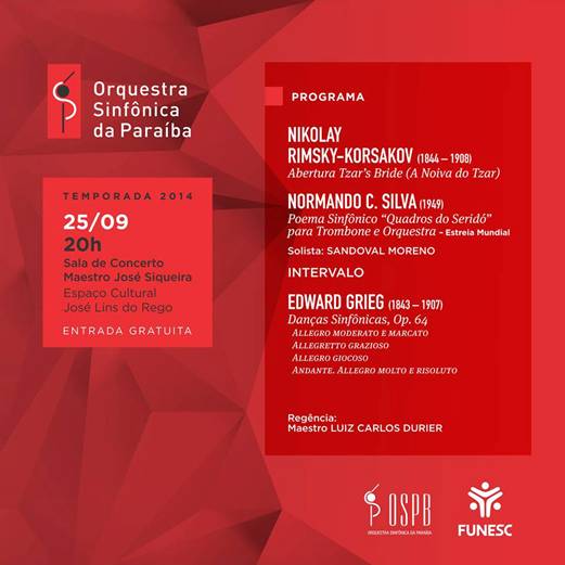 A Orquestra Sinfônica da Paraíba (OSPB) se apresenta, nesta quinta-feira (25), sob a batuta de seu regente titular, Luiz Carlos Durier. O terceiro concerto oficial da temporada 2014 do grupo contará com a participação de trombonista Sandoval Moreno como solista. Ele executará o poema sinfônico “Quadros do Seridó” para trombone e orquestra (estreia mundial), de Normando C. Silva. As outras duas obras que completam o repertório serão executadas pela primeira vez em solo paraibano. A apresentação gratuita será às 20h, na Sala de Concertos Maestro José Siqueira.
