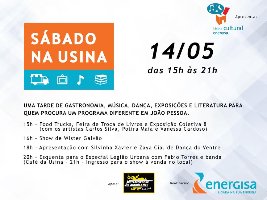 Neste sábado, 14, a Usina Cultural Energisa sedia um evento que vai agitar o fim de semana em João Pessoa: é o Sábado na Usina, que oferece opções culturais como shows, exposições, gastronomia e apresentações em diversas vertentes artísticas, além de uma feira de troca de livros para reunir os amantes da literatura. A programação do Sábado na Usina começa às 15h e vai até às 21h, com entrada gratuita.