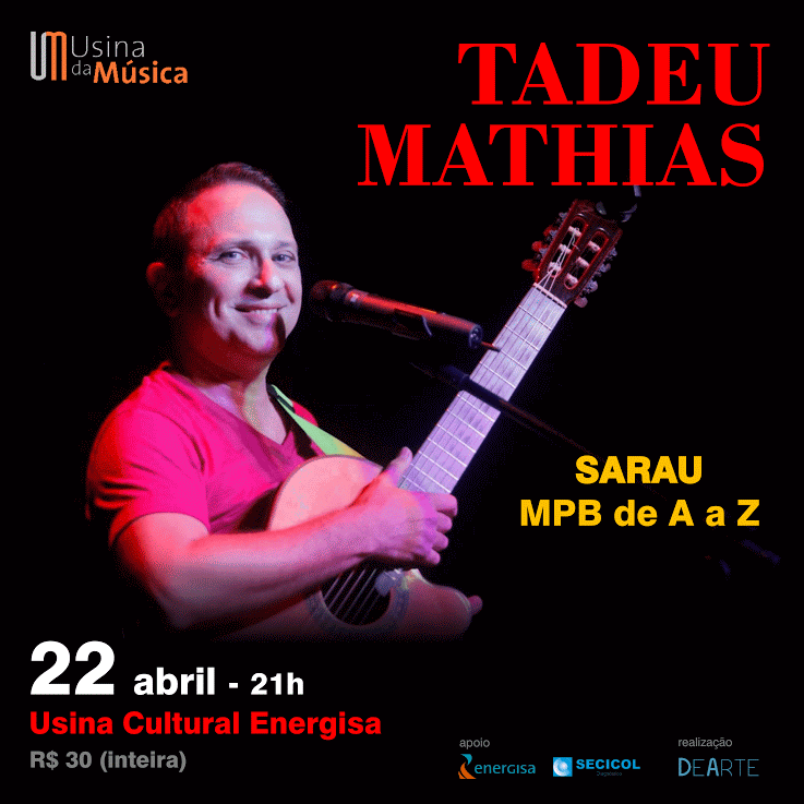 Em sua última passagem pela Paraíba, em janeiro deste ano, Tadeu Mathias presenteou o seu público com uma palhinha do que seria o show Sarau – MPB de A a Z, reunindo, no palco, convidados e parceiros desta e de longas datas como Guga Limeira, Família Pádua, Capilé, Fuba, Renata Arruda e amigos. Os shows são uma produção da DeArte Produções.