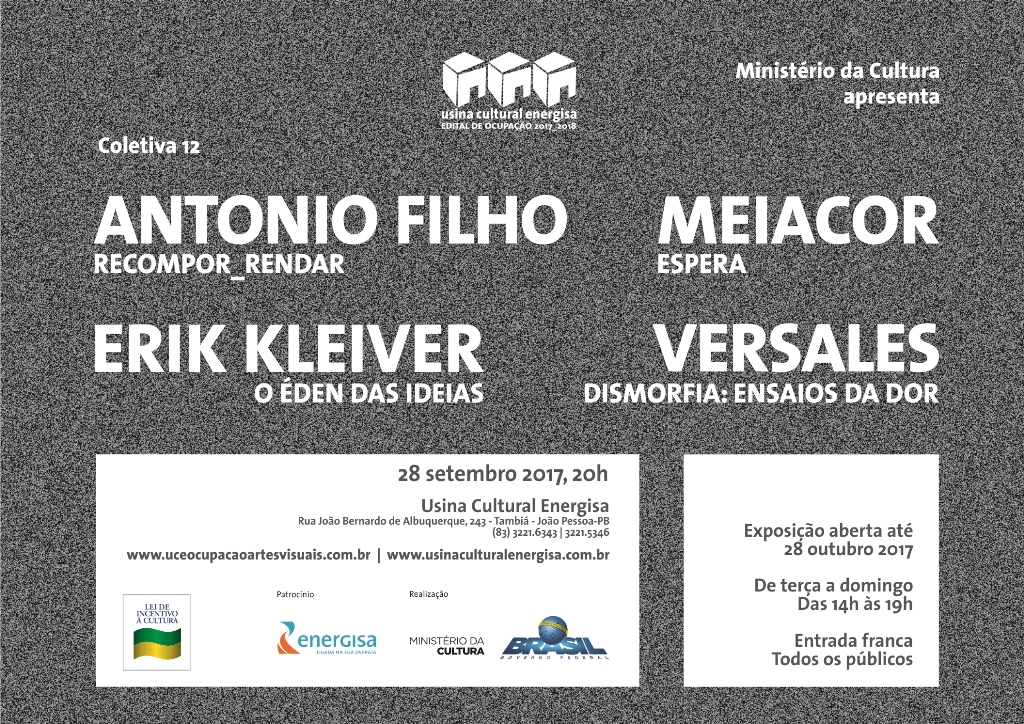 O Edital de Ocupação da Galeria 2017/2018 é realizado e patrocinado pela Energisa Paraíba, por meio da Lei Rouanet (Ministério da Cultura). A ‘Coletiva 12’ traz quatro exposições em uma. São elas: ‘Recompor_Rendar’, de Antonio Filho; ‘O Éden das Ideias’, de Erik Kleiver; ‘Espera’, de Meiacor e ‘Dismorfia: Ensaios da dor’, de Versales.