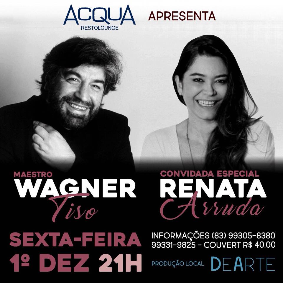 O Maestro Wagner Tiso, realiza nesta sexta-feira (1), uma apresentação com a participação especial da cantora Renata Arruda, a partir das 21h no Acqua Restolounge.