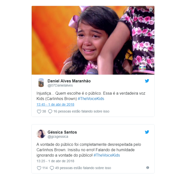 O problema é que Carlinhos escolheu Talita, contrariando a votação do público na internet. A revolta foi tanta que as hashtags #CarlinhosBrown e #TheVoiceKidsBrasil ficaram entre os assuntos mais tuitados deste domingo.