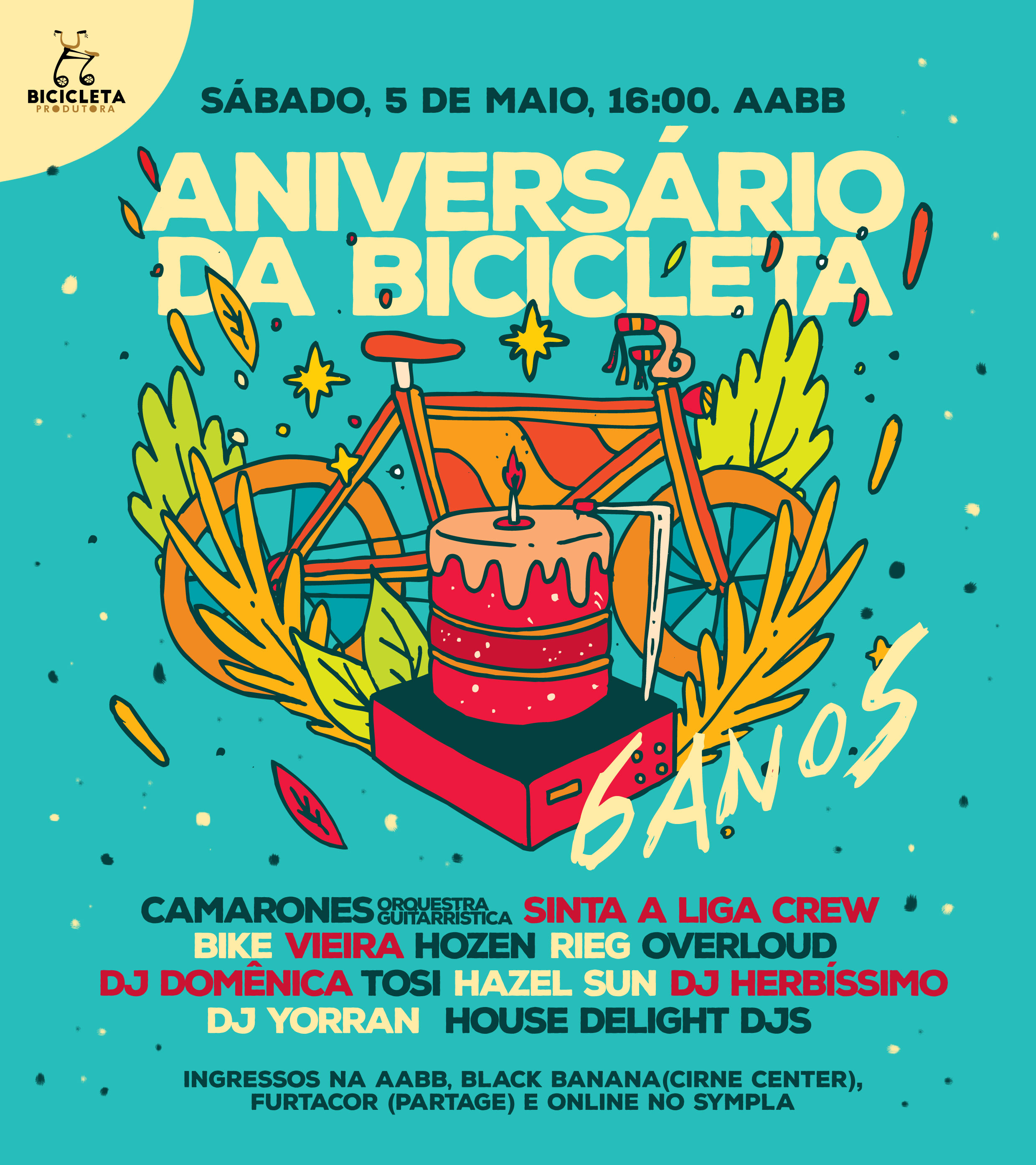 Artistas da cidade, do estado e nomes de São Paulo e Natal compõem a programação do evento ‘Aniversário da Bicicleta’, que conta com mais de doze horas de duração. Dentre os confirmados estão bandas de Rock, um grupo de Rap formado em sua quase totalidade por mulheres, DJs de música Pop e Eletrônica.